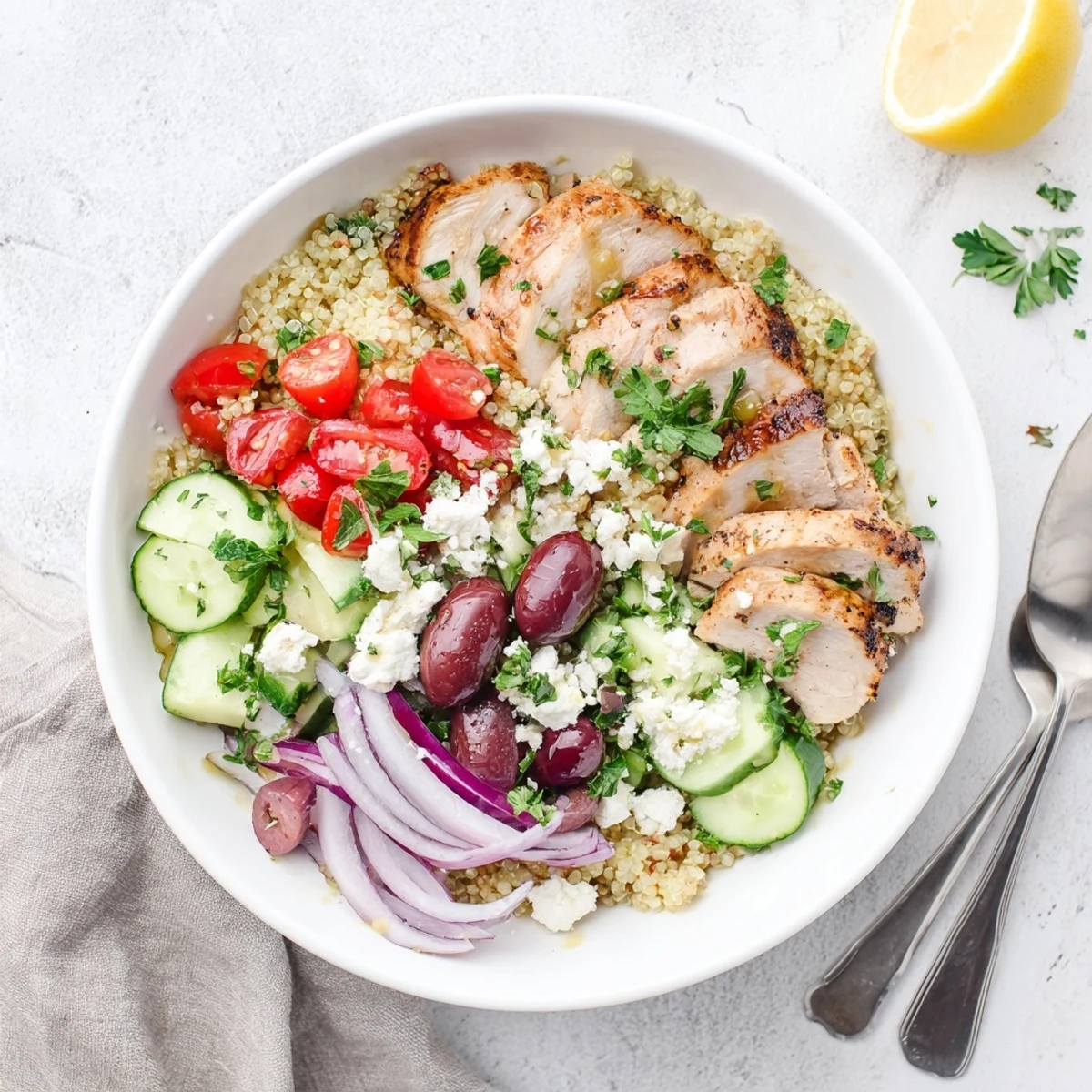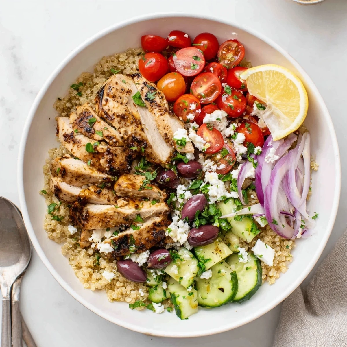 This vibrant bowl brings together tender grilled chicken seasoned with oregano, smoked paprika, and cumin alongside fluffy quinoa cooked in savory broth. Fresh cherry tomatoes, crisp cucumber, red onion, and briny Kalamata olives add layers of texture and Mediterranean flair, while crumbled feta provides a creamy, tangy finish. A bright lemon-honey dressing ties everything together perfectly.